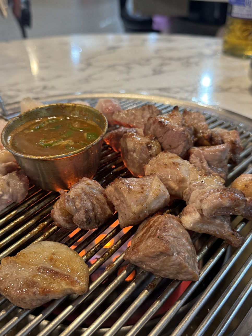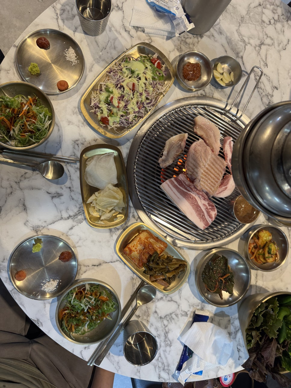 사장님이 고기 하나씩 궈주시면서 뭐랑 뭐랑 찍어먹어보라고 알려주시고 한입씩 먹어보고 자기 스탈대로 먹으면 된다.